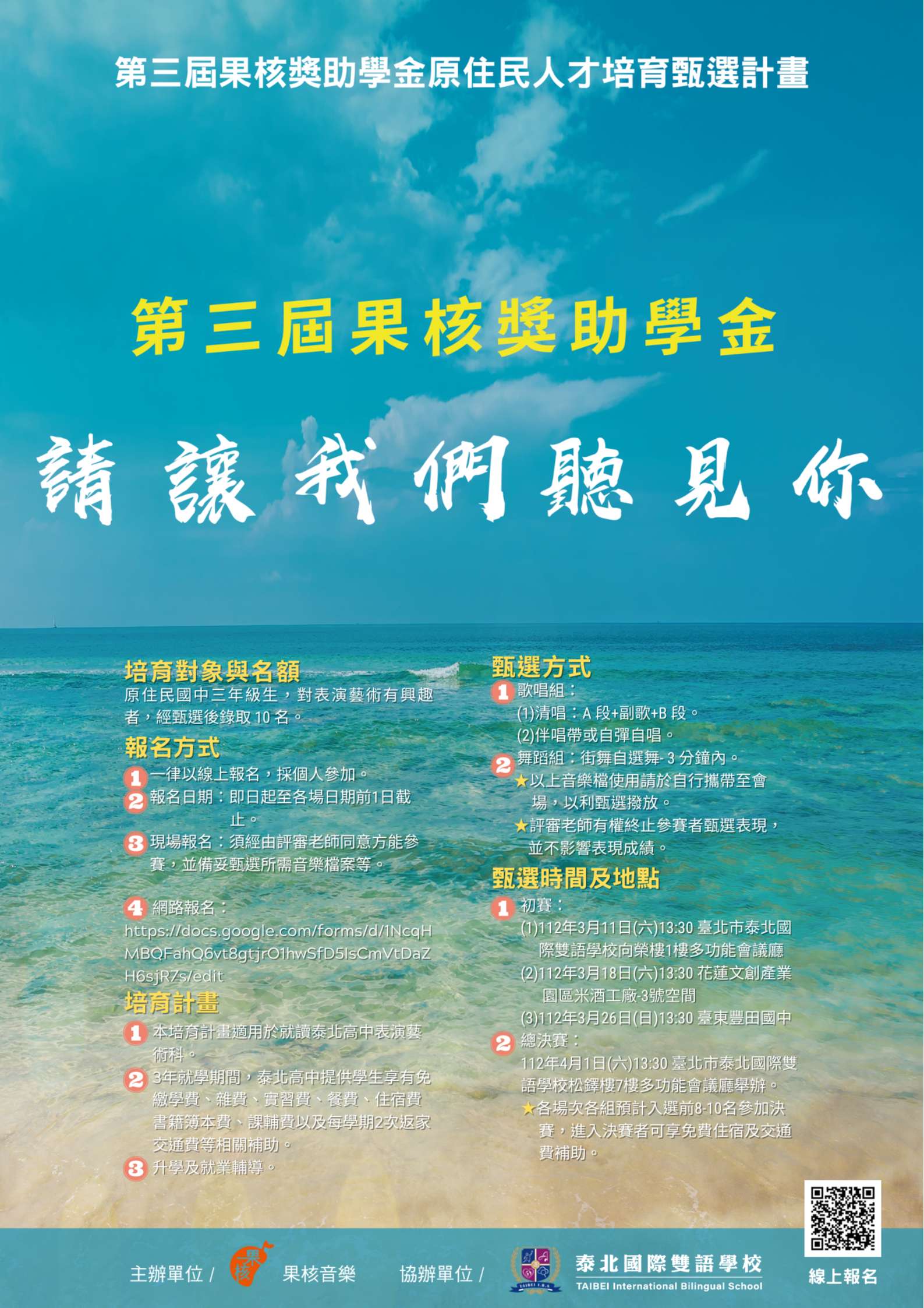 一、為培育原住民族群發展表演藝術潛能,臺北市私立泰北高級中學與果核有限公司合作,以才藝甄選方式招收原住民學生,進行人才培育計畫。