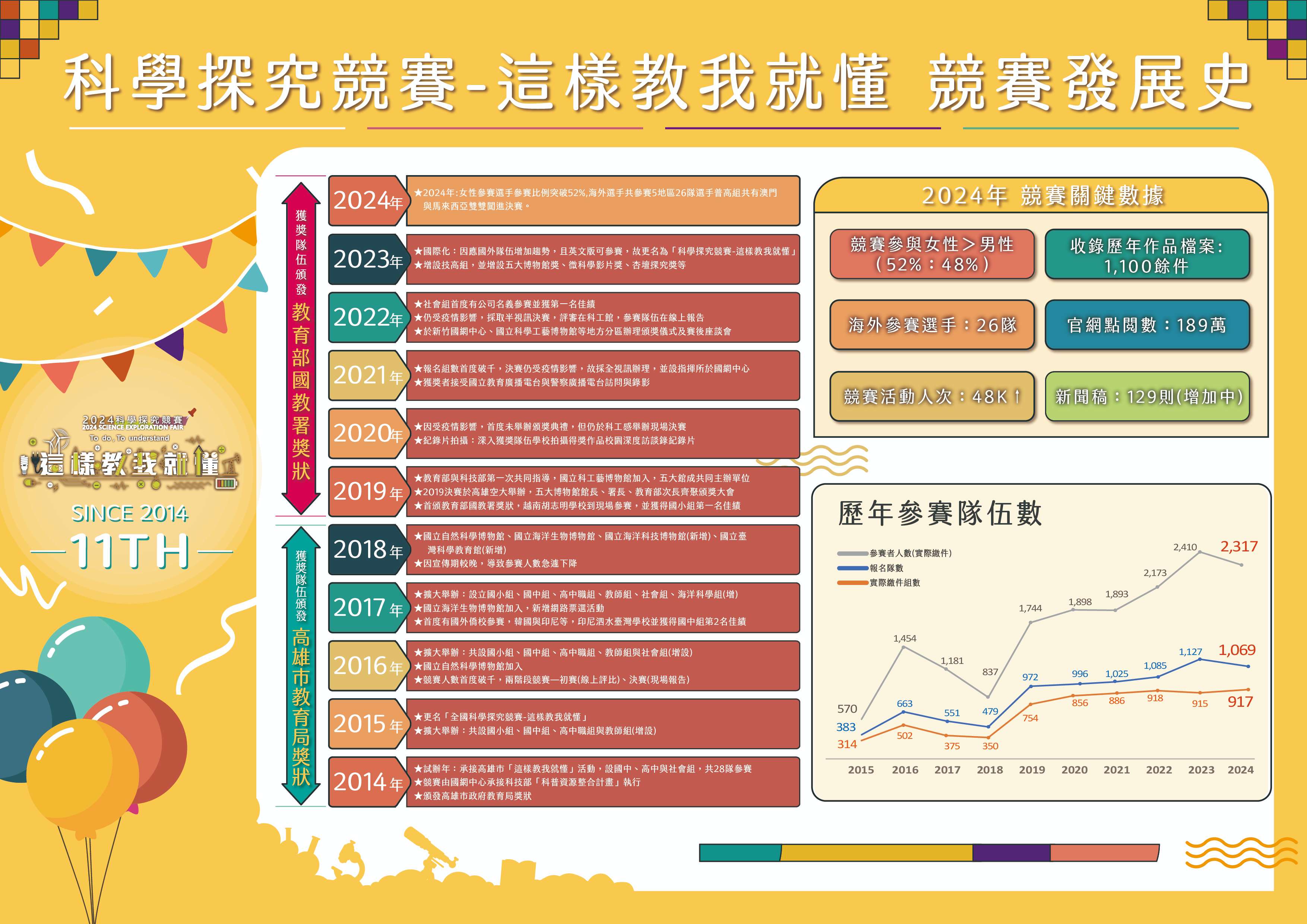 二、旨揭競賽活動自2014年起迄今已辦理10年,指導單位為教 育部國民及學前教育署,共同主辦單位為國立自然科學博 物館、國立海洋生物博物館、國立海洋科技博物館及國立 臺灣科學教育館、國立科學工藝博物館、國家高速網路與 計算中心、國立臺灣師範大學及國立高雄師範大學。競賽 分為國小、國中、普高、技高、教師及大專/社會組。