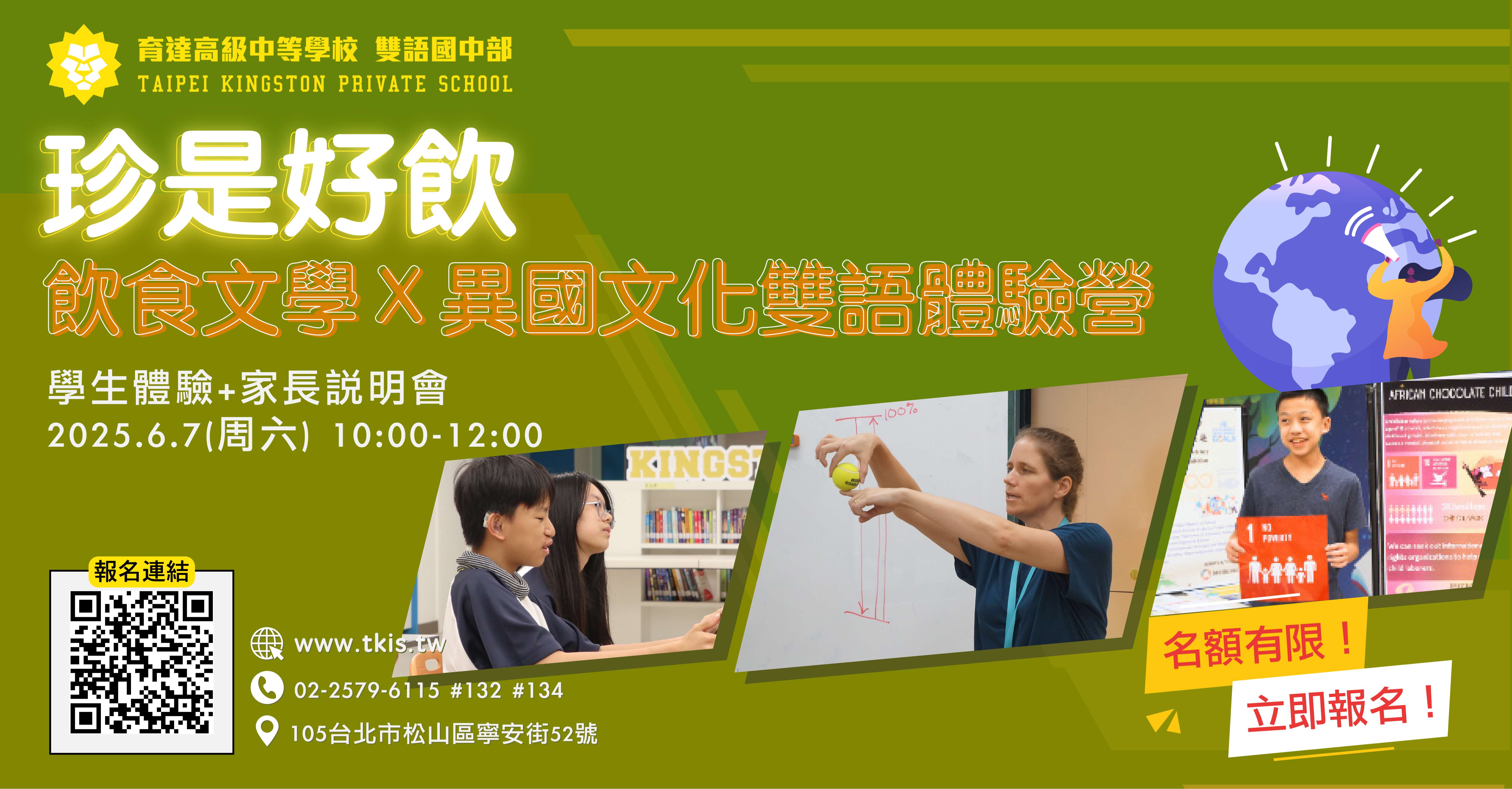 一、課程介紹:在全球化的時代,雙語能力是孩子未來發展的重要資產,本次Kingston雙語體驗營集結本校外師與中師,設計一系列豐富有趣的體驗課程,讓學生能在半日時光中以地球永續的概念,品嚐美味飲品同時寫出優美的飲食文學,外師分享異國飲食文化,打開國際觀!我們也在同一時間安排入學說明會,深入介紹我們的課程規劃與環境導覽,歡迎爸爸媽媽帶著您的孩子一同報名參加!
