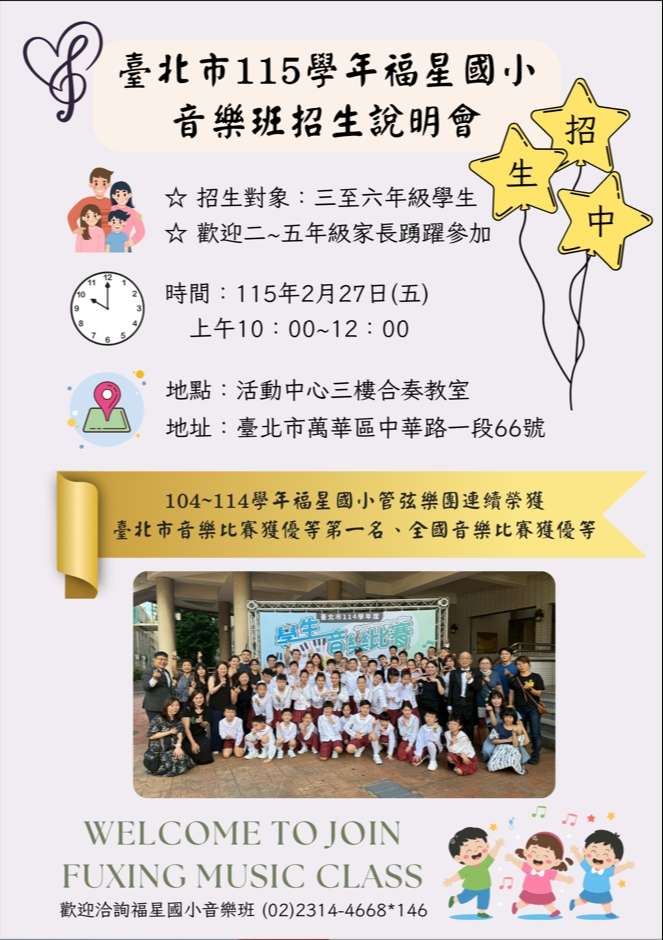 一、福星國小今年承辦臺北市115學年度國民小學藝術才能音樂班招 生。