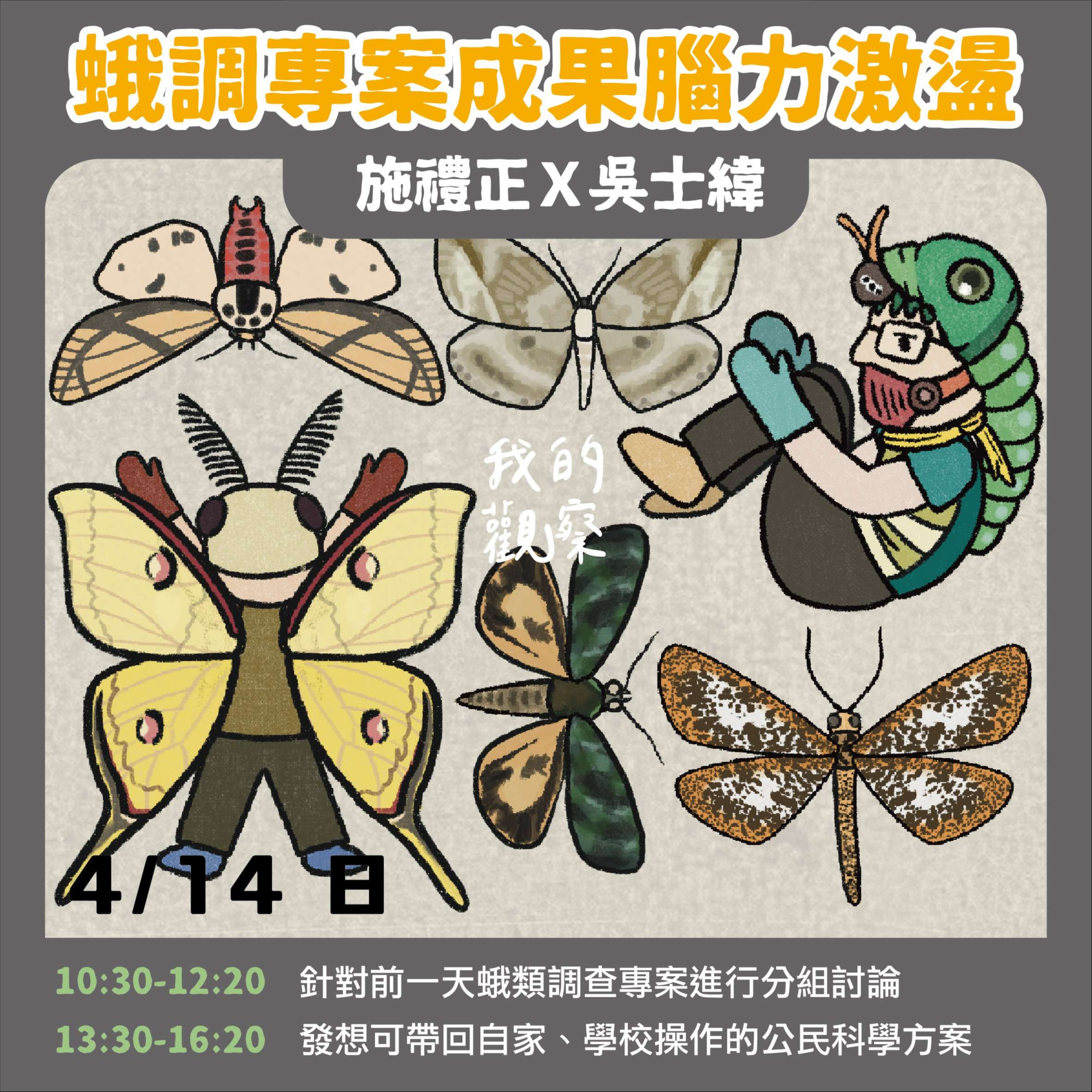 一、工作坊時間及內容: (一)第一天: 1、時間:113年4月13日 (星期六)13時30分至21時10 分。 2、課程簡介:結合FB社群與「iNaturalist」專案實作分 享、專案探討—「慕光之城:臺灣飛蛾紀錄網」, 臺 北暗夜之美—蛾類調查野外實習。 (二)第二天: 1、時間:113年4月14日 (星期日)13時30分至20時20 分。2、課程簡介:「iNaturalist 腦力激盪」,分組討論昨 夜的蛾類調查專案、並與去年度的資料作分析比對, 發想可自行帶回家裡及學校持續操作的公民科學專 案,服務學習專案報告討論與指導。
