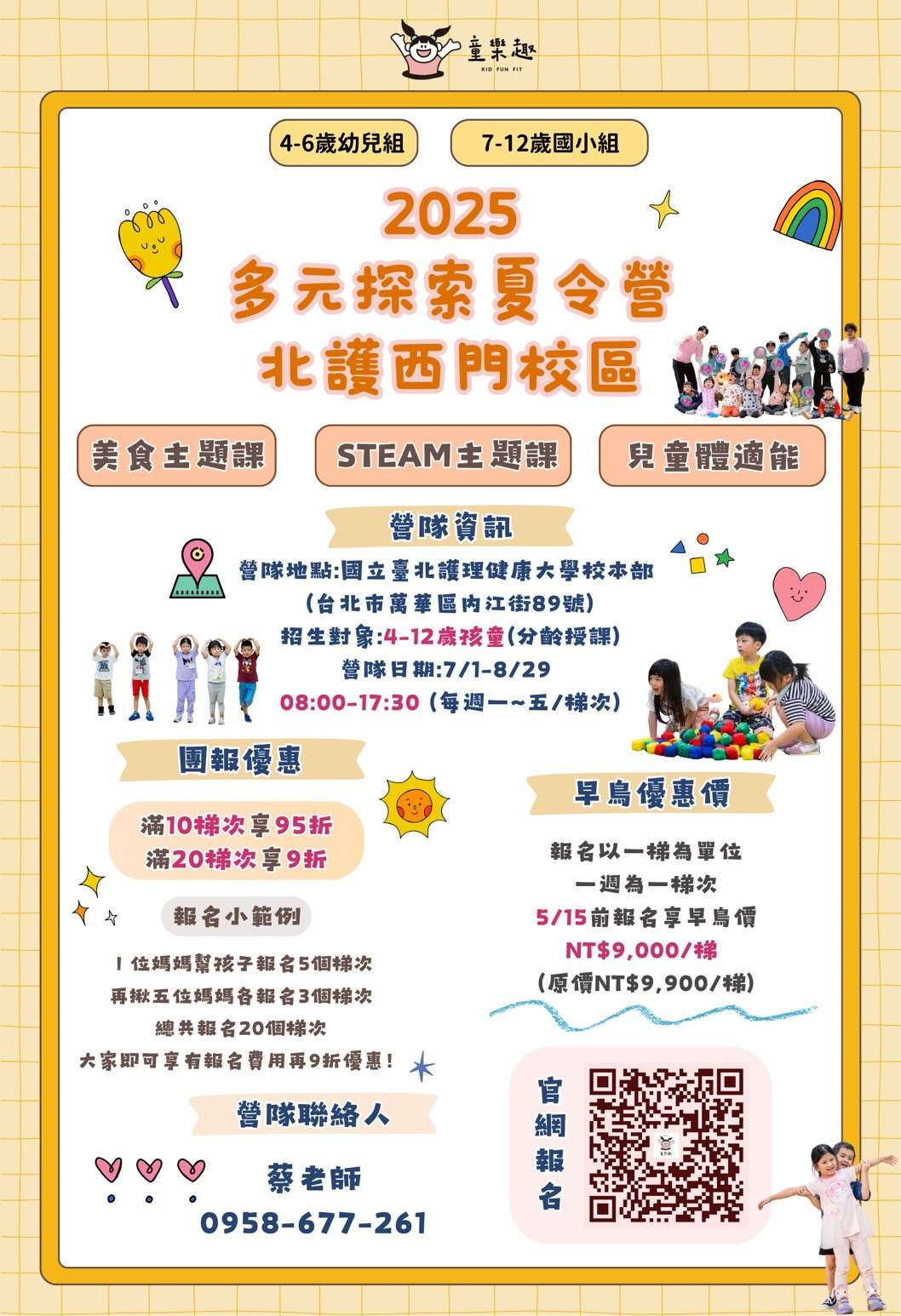 國立臺北護理健康大學推廣教育中心與童博健康管理工作室合作開辦 「2025西門校區-多元探索夏令營」,招生對象:4-6歲幼兒組、7-12歲國小組。