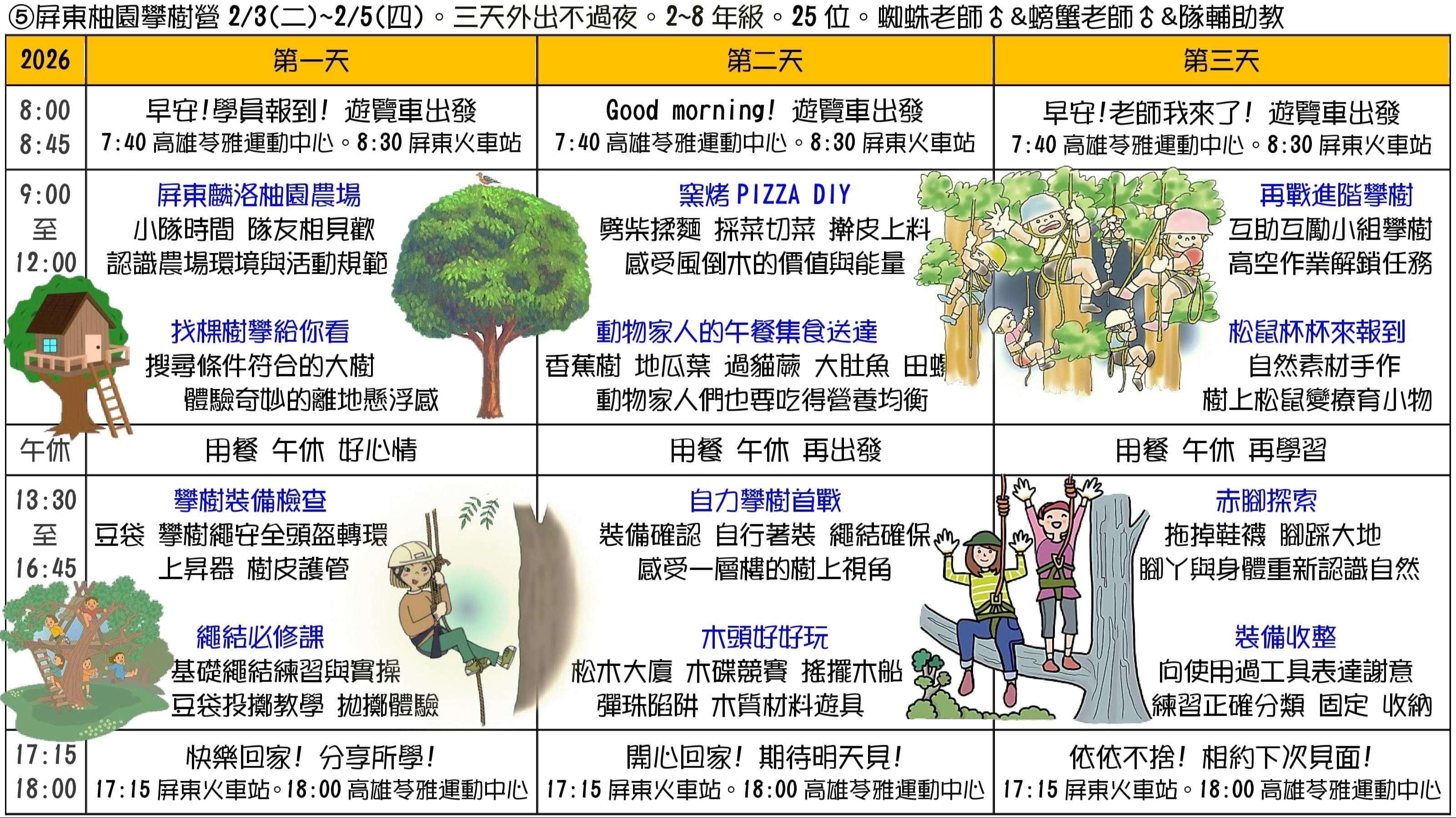 二、課程主題:①蘭陽山野求生營(5天4夜)、②小琉球海龜營 (5天4夜)、③宜蘭生態農場營(3天2夜)、④TPE博物館生態 營(3天外出不過夜)、⑤屏東柚園攀樹營(3天外出不過 夜)、⑥節肢小怪獸營(3天大學不過夜)、⑦池上單車生態 營(4天3夜)。