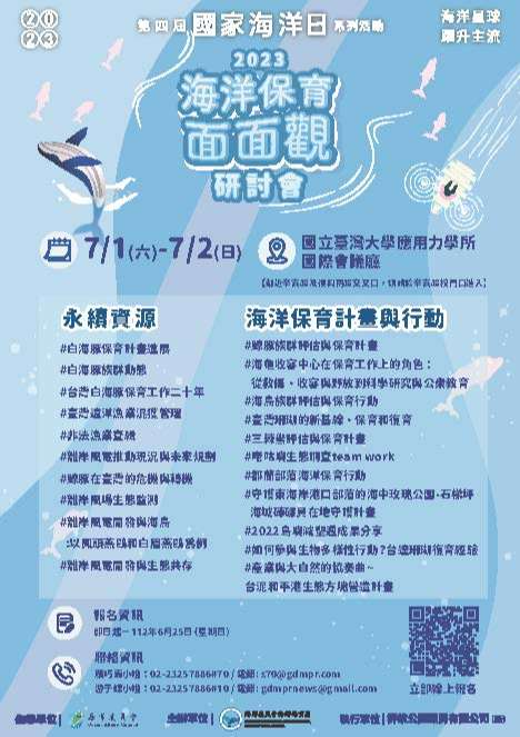 二、查旨揭研討會係訂於112年7月1-2日(星期六-日)假國立 臺灣大學應用力學研究所國際會議廳舉行,為鼓勵所屬同 仁參與海洋保育事務,海保署將提供全程參與之公務人員 終身學習時數;請貴單位轉知所屬於6月25日(星期日)前 踴躍報名,並提供出席人員公假參與。