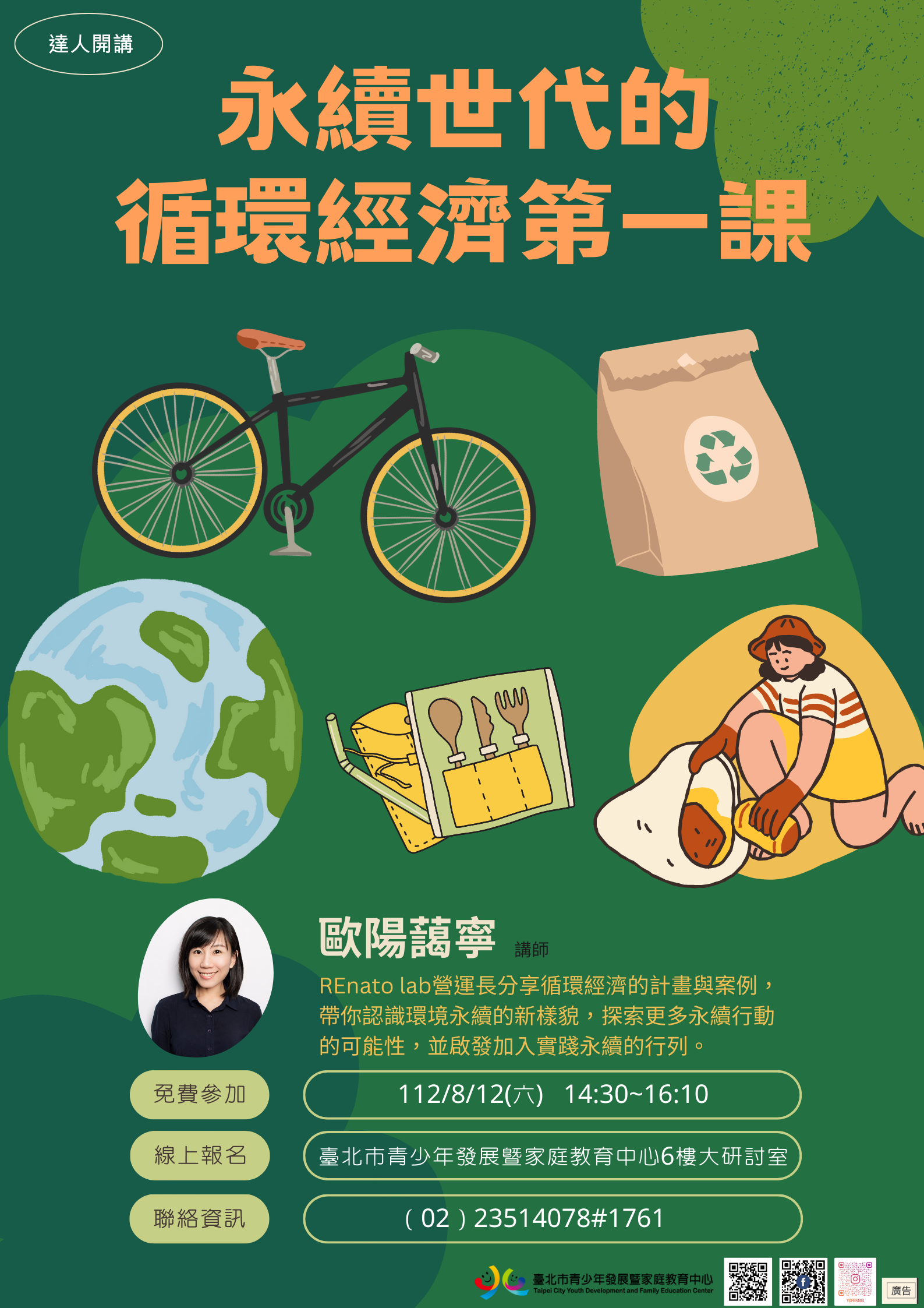 三、宣傳稿內容如下: (一)90字:臺北市青少年發展暨家庭教育中心8月12日14:30 舉辦達人開講「永續世代的循環經濟第一課」,REnato lab營運長歐陽藹寧老師與您分享她踏上致力於實踐永續 的心路歷程,以及過程中的體驗。活動免費,詳見青發 家教中心官網。 (二)60字:臺北市青少年發展暨家庭教育中心8月12日14:30 舉辦達人開講:永續世代的循環經濟第一課。歐陽藹寧 與您分享她踏上致力於實踐永續的心路歷程;活動免費 詳見青發家教中心官網。 (三)30字:青發家教中心8/12歐陽藹寧開講:永續世代的循 環經濟第一課。活動免費詳官網。