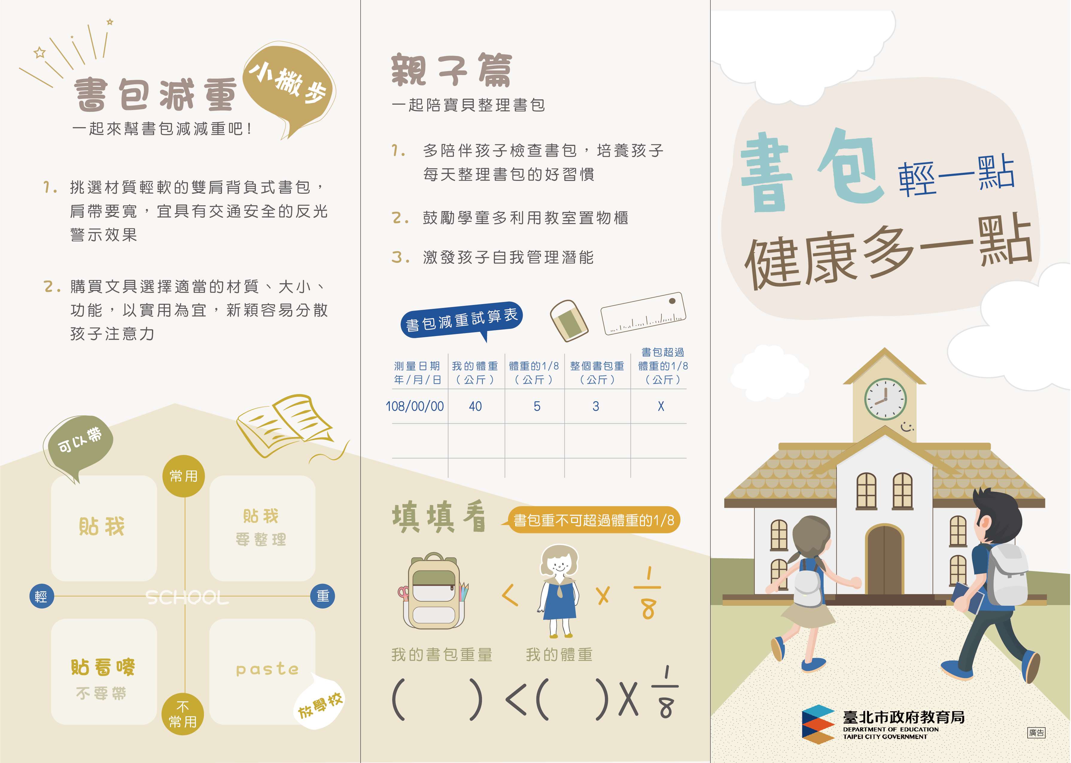 為減輕學童壓力來源,培養良好之正確學習習慣與維護身 心健康發展,持續落實學童書包減重措施