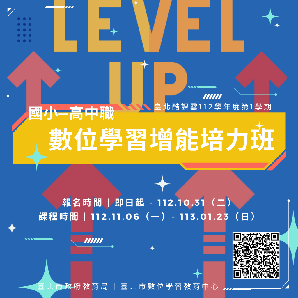 二、為持續推廣臺北酷課雲平臺使用及培育學生自主學習能 力,落實數位教育資源共享理念,本局於112學年度第1學 期辦理「國小—高中職數位學習增能培力班」,提供各學 層學生免費課後線上課程服務。