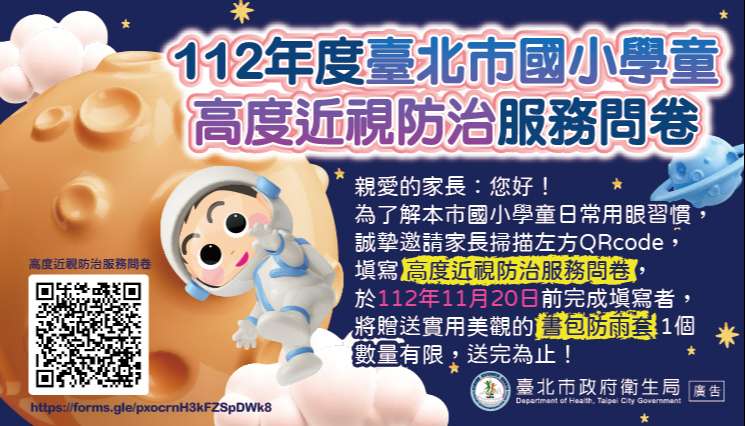 二、本局與本府教育局自102年起,補助本市國小1-6年級學童 每年1次專業視力檢查,協助家長培養孩子規律視力檢查及 掌握近視風險。為了解本市學童日常用眼習慣,本局委託 國立陽明交通大學進行旨揭問卷分析,以為研擬兒童近視 防治相關策略參考。 三、檢送旨揭問卷線上表單(網址:https://forms.gle /pxocrnH3kFZSpDWk8)及聯絡本貼紙電子檔(如附件), 紙本業於112年11月2日以郵局掛號方式寄出,請貴校善加 運用。另提早於112年11月20日前完成填寫問卷者(期限至 11月30日止),本局將透過學校致贈「書包反光防雨套」1 個,數量有限,請貴校鼓勵家長踴躍填寫。