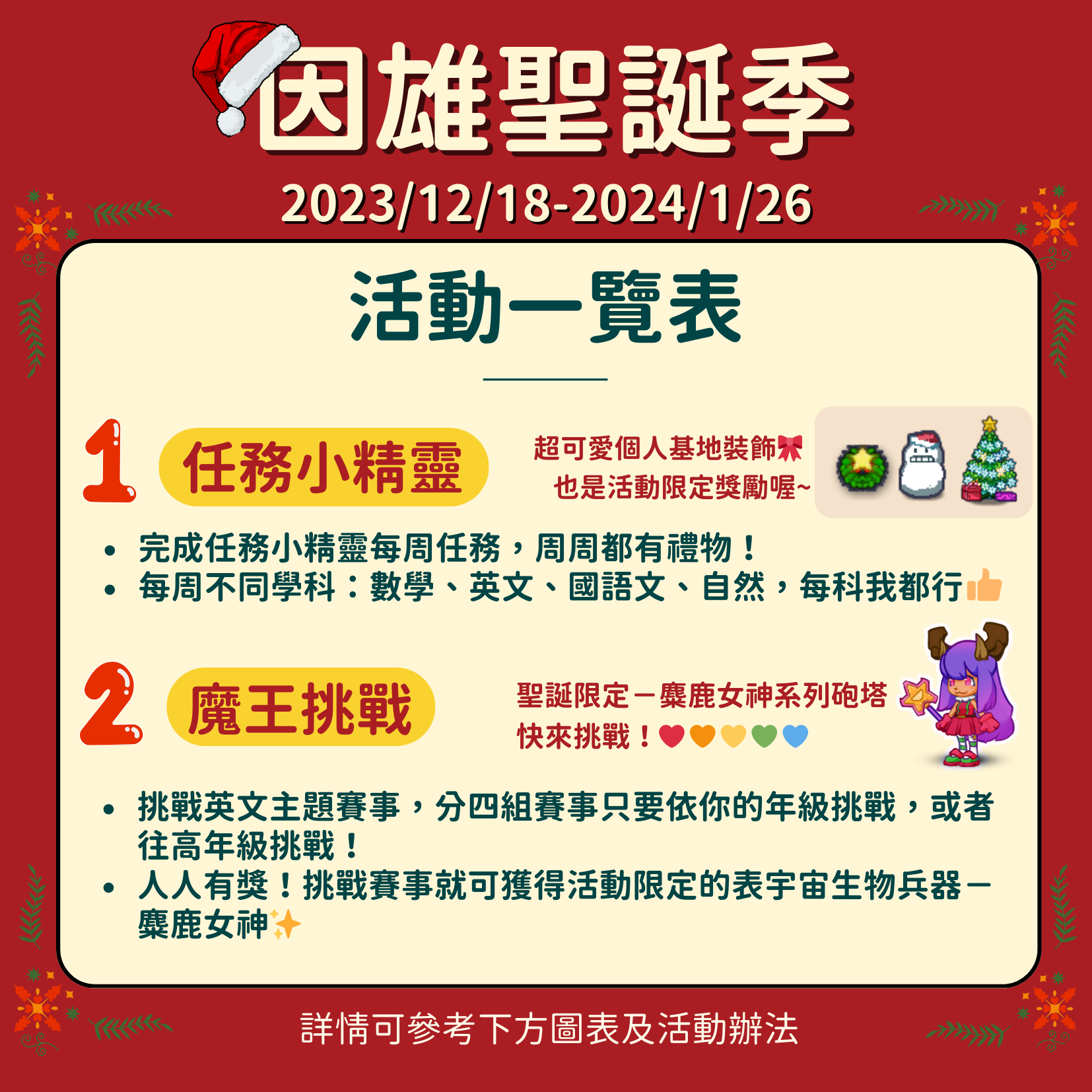 二、旨揭活動於112年12月18日(星期一)起至113年1月26日 (星期五)止,每日7時至22時,歡迎全國師生踴躍參加。 詳細活動內容請參閱官網(https://adl.edu.tw/hero/) 及