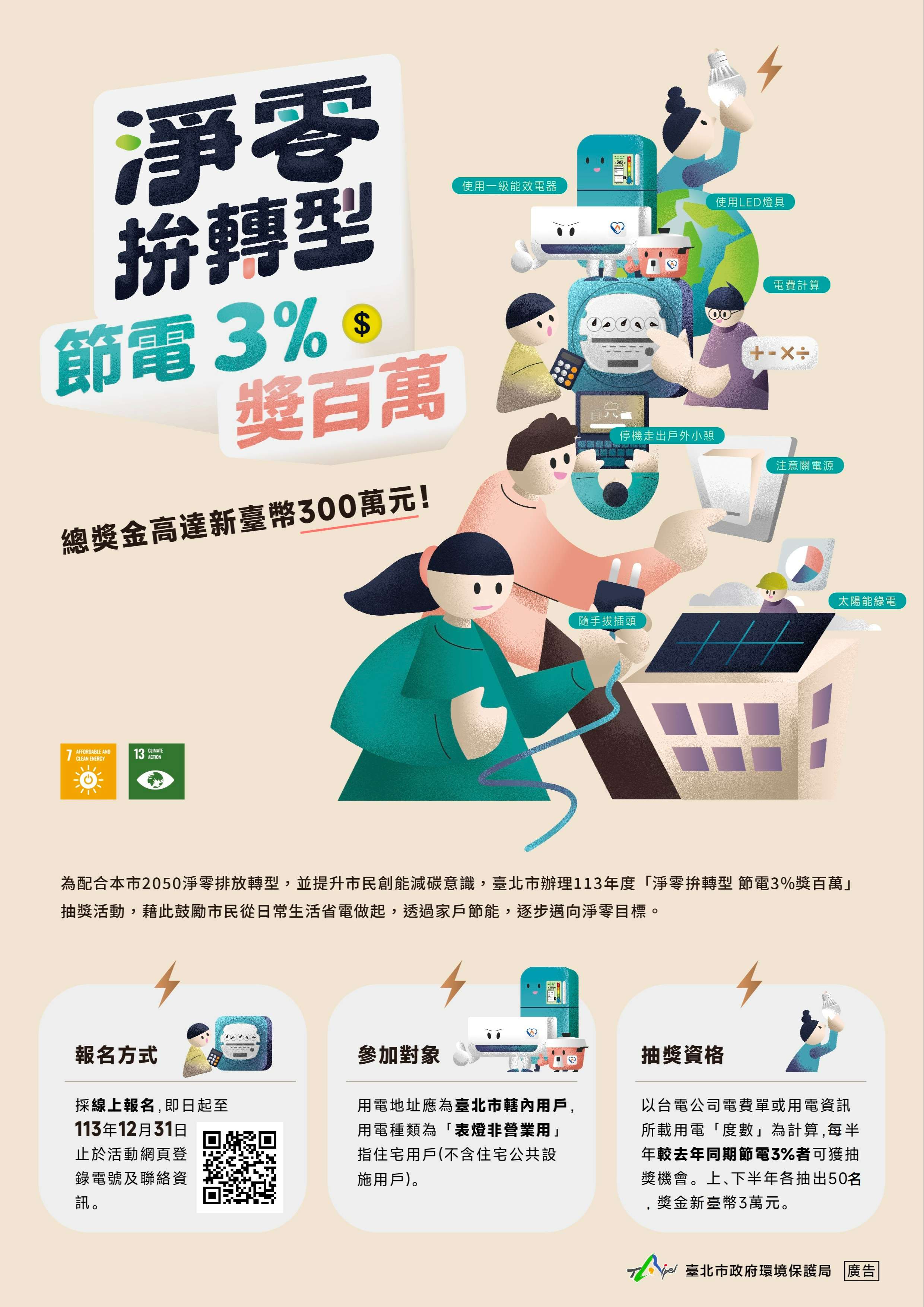 二、本府環境保護局為鼓勵市民落實節能減碳行動,即日起至 113年12月31日辦理「淨零拚轉型節電3%獎百萬」抽獎活 動,參加對象為臺北市轄內「住宅用戶」,每半年較去年 同期節電達3%即可參加抽獎,113上下半年各抽出50名,每 名獎金新臺幣3萬元。