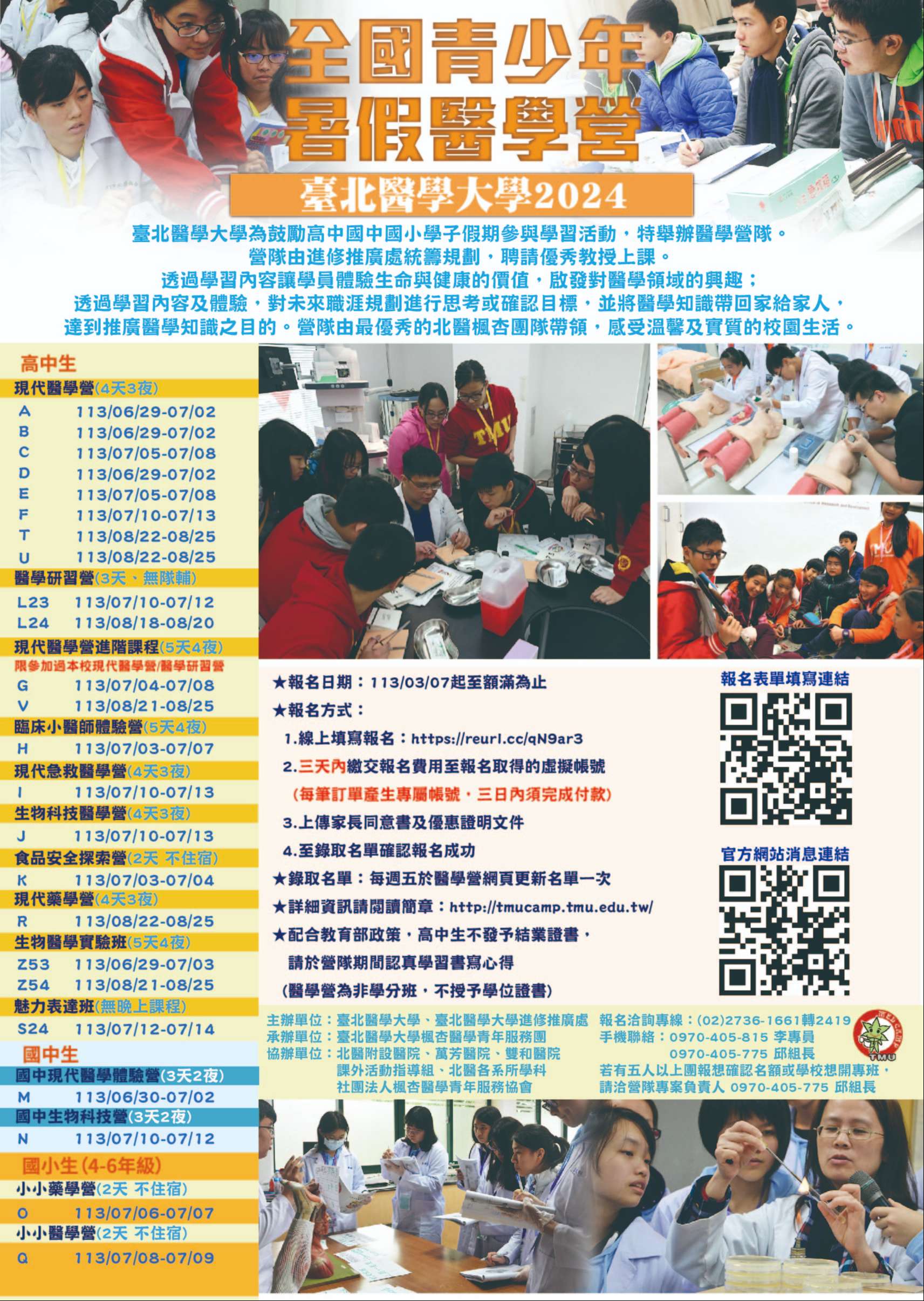 二、營隊資訊:2024暑期醫學營擬訂於民國113年6月29日至8月 25日辦理。網址 http://tmucamp.tmu.edu.tw/