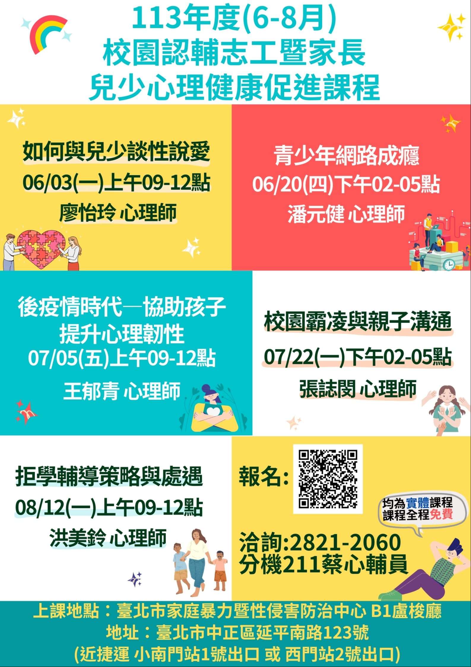 (二)課程辦理方式及地點:5場次實體,上課地點為臺北市家 庭暴力暨性侵害防治中心B1盧梭廳(臺北市中正區延平 南路123號),地點若異動將以電子郵件通知。
