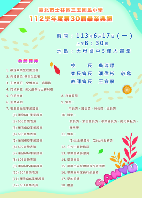 本校將於113年6月17日(一)上午8點30分起,假天母國中5樓大禮堂舉辦第30屆畢業典禮,相關典禮程序請詳閱附件。