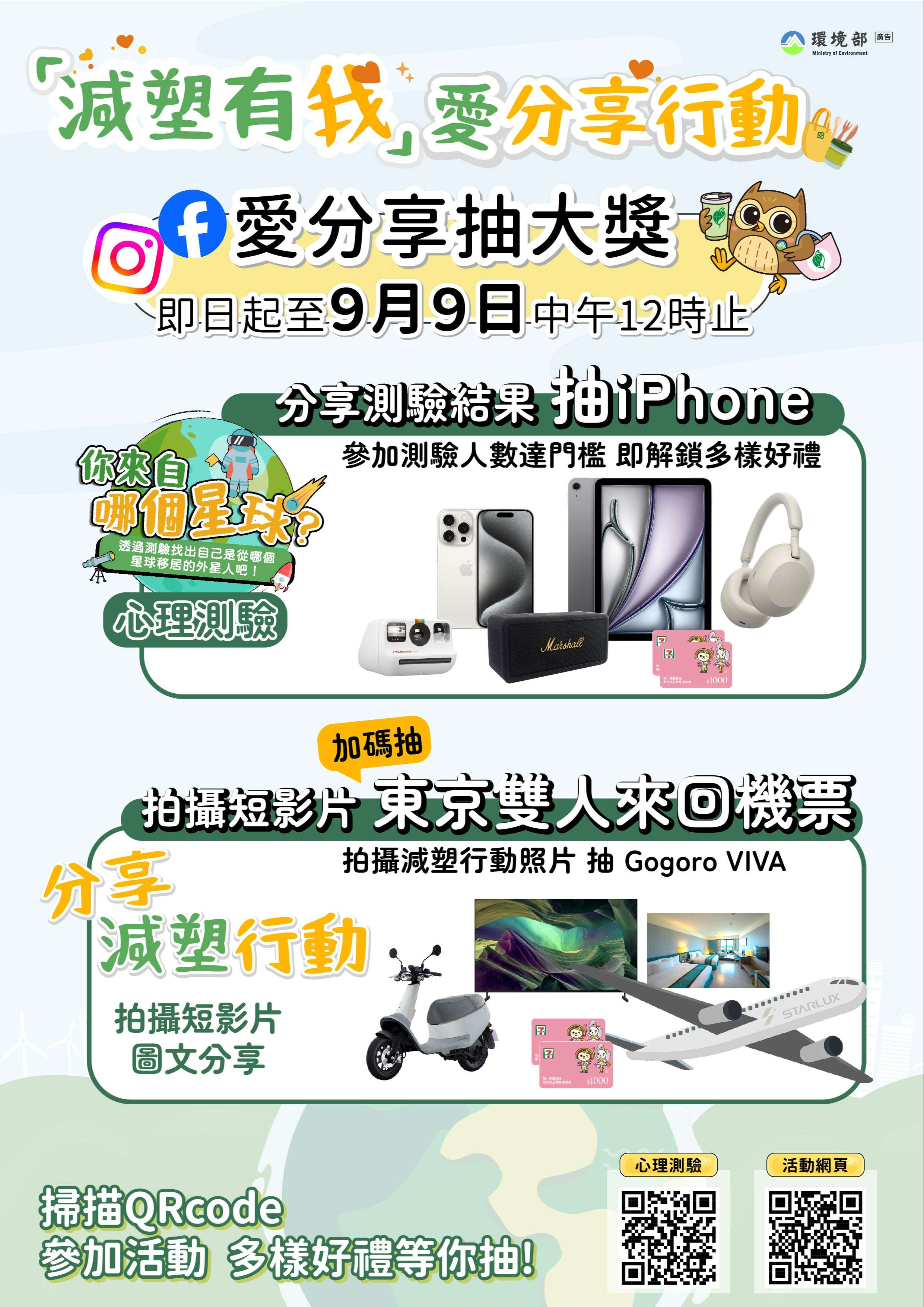 二、環境部為鼓勵社會大眾及莘莘學子在暑期假期間一起跟上 全球減少塑膠的風潮,特辦理「減塑有我」愛分享行動, 可透過臉書(Facebook)、Instagram(IG)等社群媒體, 拍攝個人生活中減塑短影片、減塑生活照片,並可透過參 加「你來自哪個星球?」心理測驗遊戲,瞭解並發覺屬於 自己獨特的環保行動,歡迎民眾邀請親朋好友一起在生活 中響應減塑行動,參加旨揭活動拿大獎。