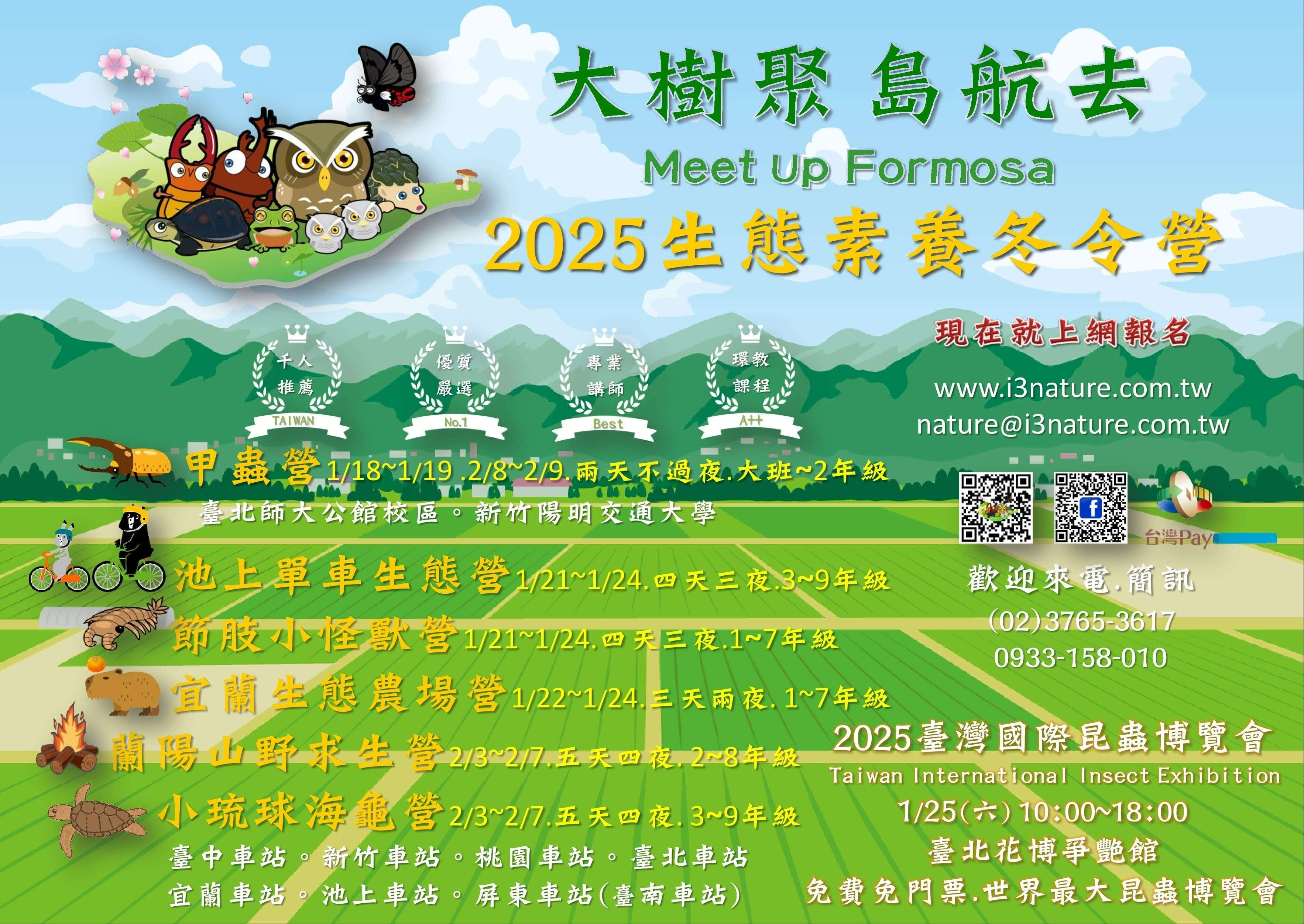 一、2025生態素養冬令營日期1/18~2/9,招生涵蓋大班-九年級 學員,依不同課程分齡參加,詳細請見網站 www. i3nature.com.tw 。