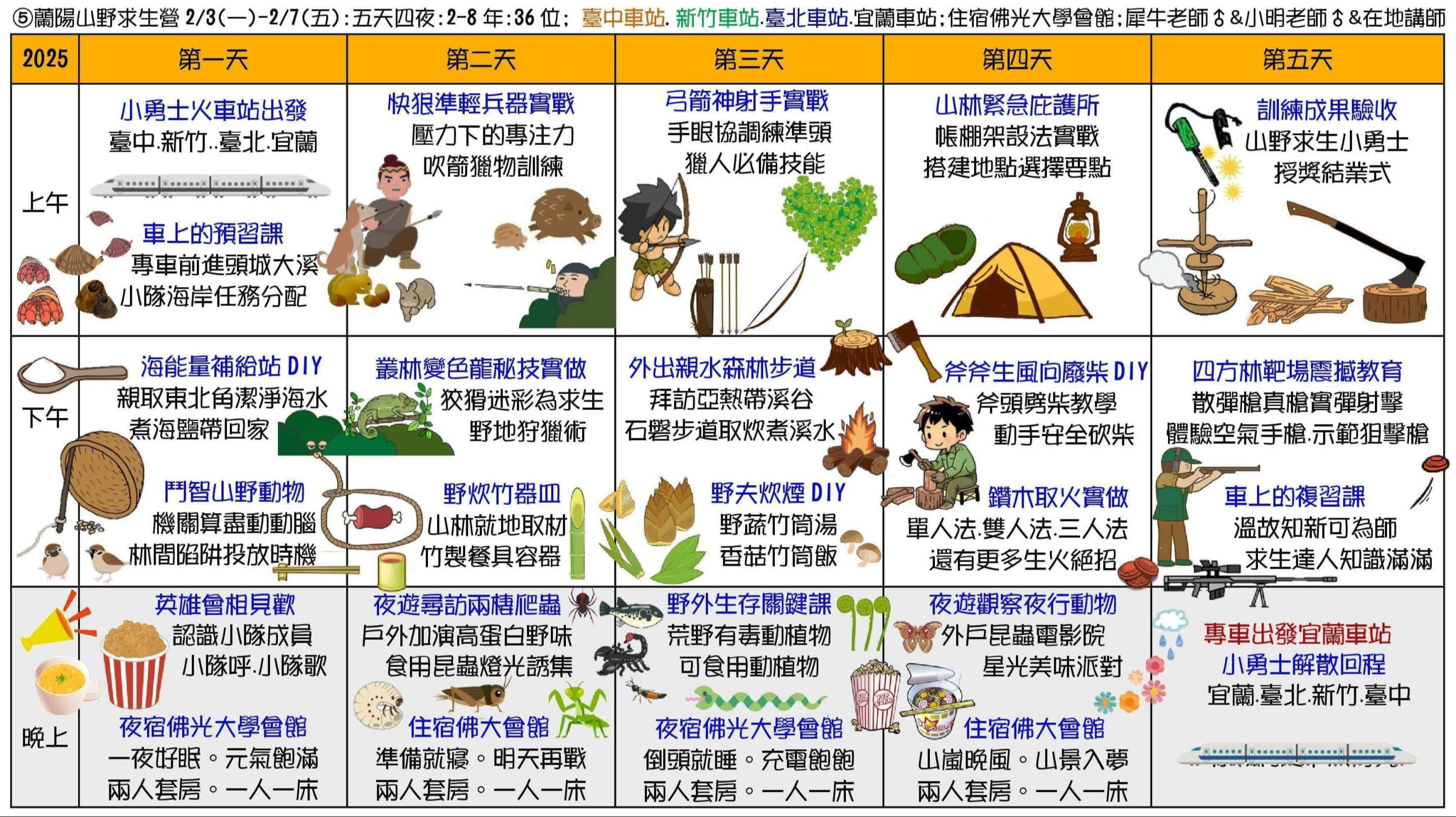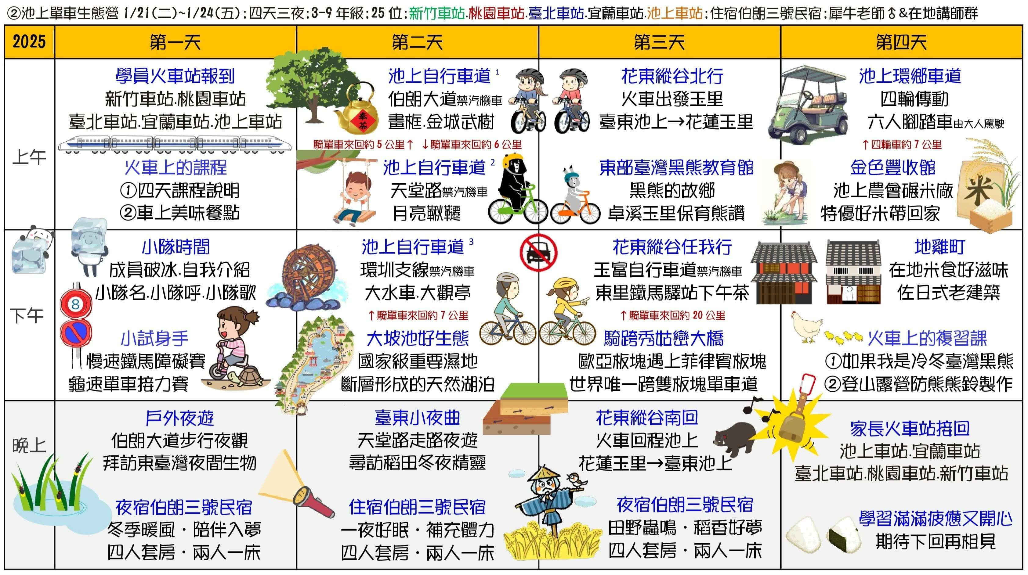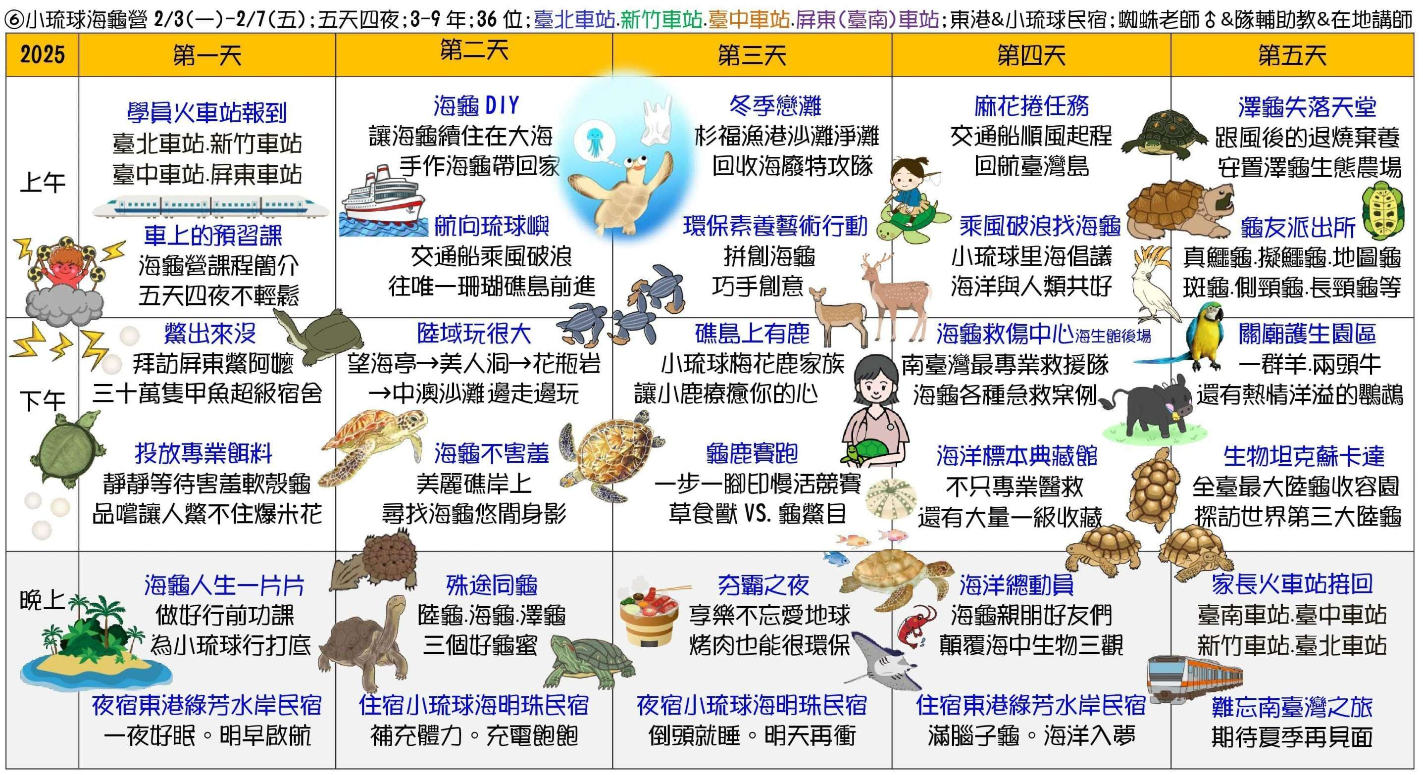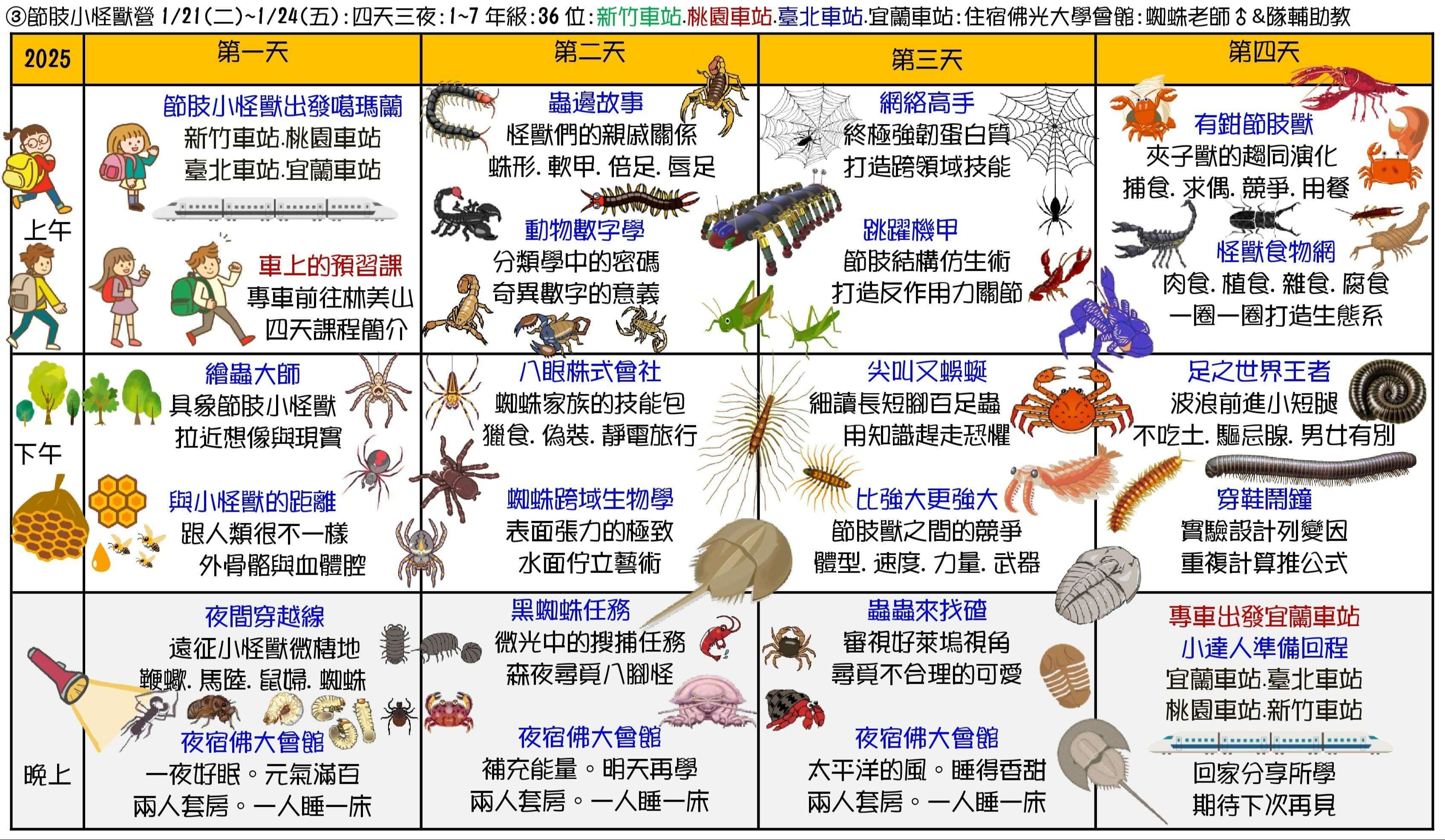 二、冬令營課程主題為:①甲蟲營(2天)、②池上單車生態營(4 天3夜)、③節肢小怪獸營(4天3夜)、④宜蘭生態農場營(3 天2夜)、⑤蘭陽山野求生營(5天4夜)、⑥小琉球海龜營(5 天4夜)。