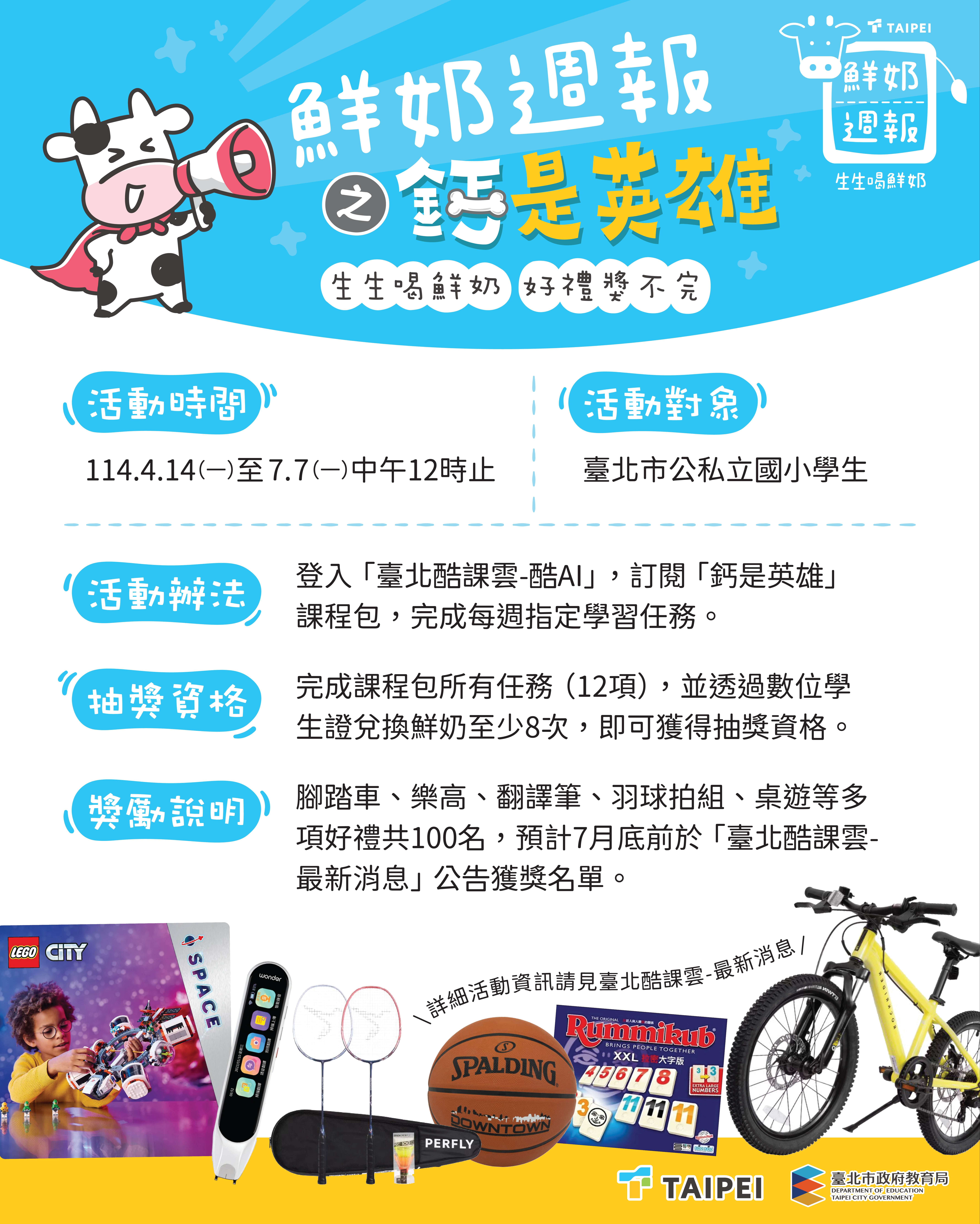 三、另請貴校所屬教師鼓勵學生積極參加酷AI課程包自主學習 活動「鮮奶週報-鈣是英雄」,活動概述如下: (一)活動時間:即日起至114年7月7 日(星期一)中午12時 (二)參加方式:透過校園單一身分驗證帳號登入「酷AI學習 系統」(https://ailms.tp.edu.tw/),訂閱「鈣是英 雄」課程包。 (三)任務說明:活動期間,每週一將更新一項課程包學習任 務,學生累積完成完成12項任務,並有透過數位學生證 兌換補助乳品(鮮奶或豆漿)至少8次,即可獲得抽獎資 格。 (四)獎勵說明:學習獎品豐富多元,包含兒童腳踏車、LEGO 樂高太空站、拍照翻譯筆、羽球拍、拉密數字桌遊等七 大獎項,總計抽出100位獲獎者,公布獲獎名單預計於 114年7月底公告並統一寄發獎品。