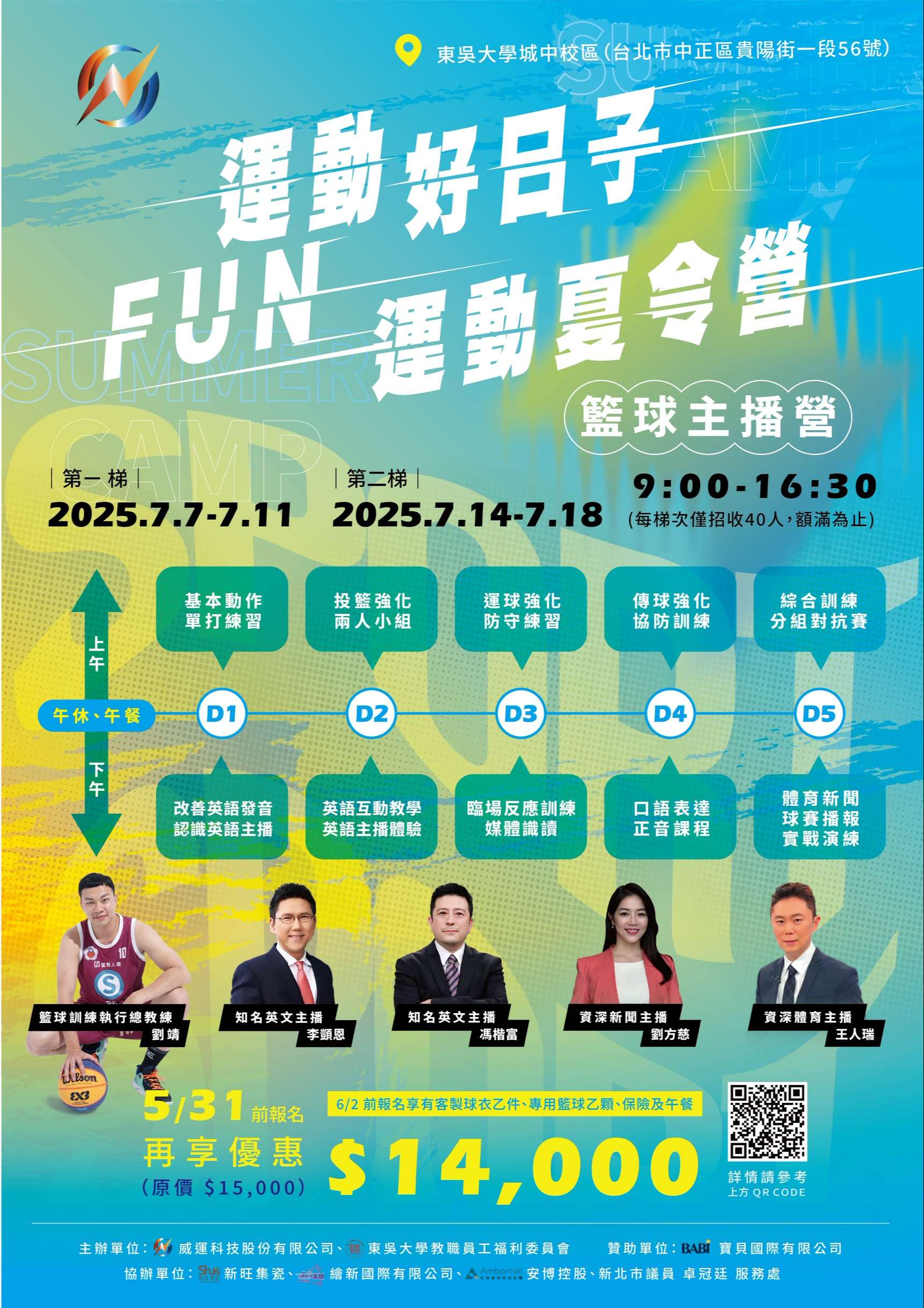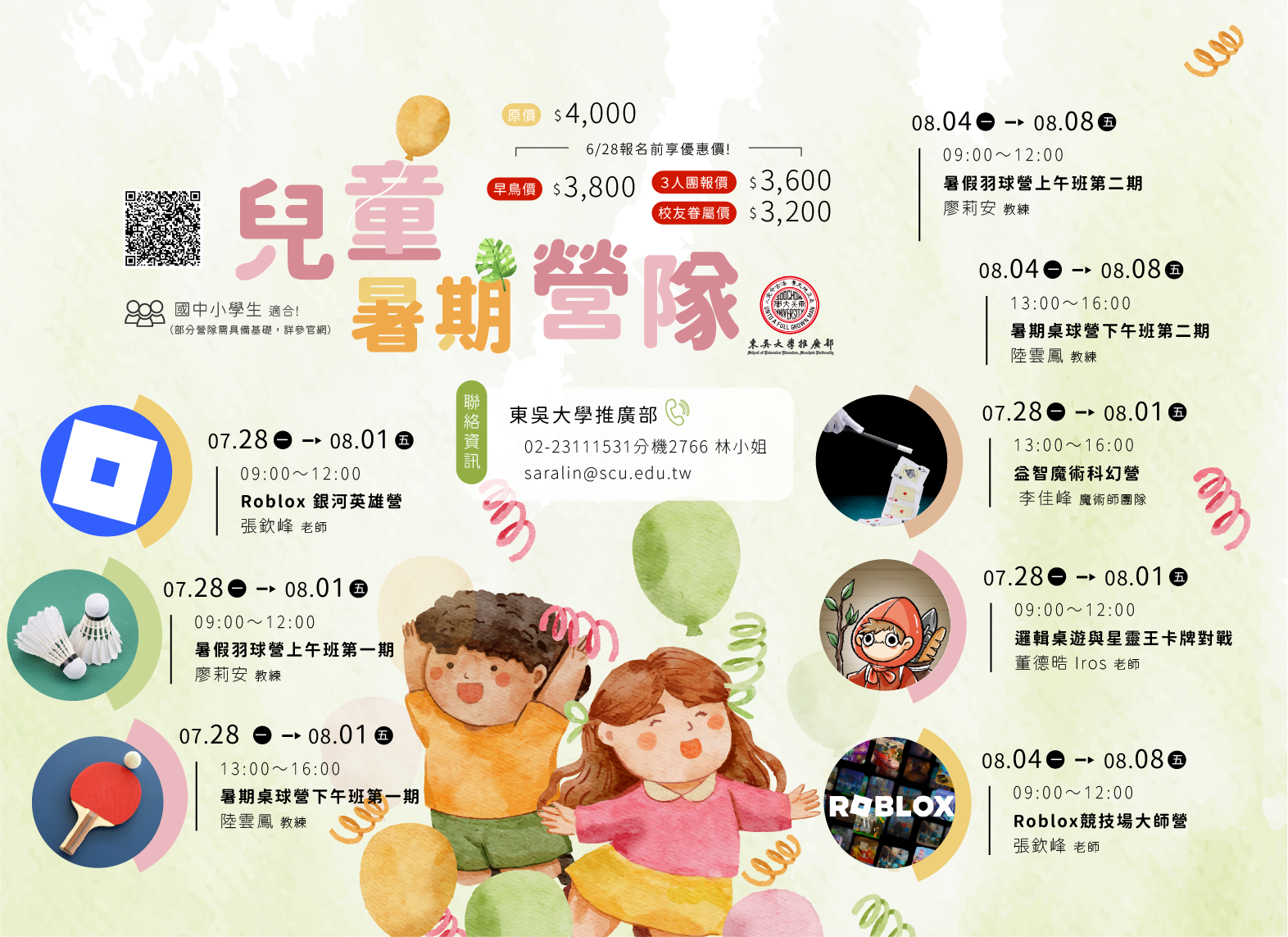 東吳大學校舉辦2025年暑假兒童營隊,本次共計招生九個研習營:Roblox銀河英雄營、邏輯桌遊與星靈王卡牌對戰、益智魔術科幻營、暑期桌球營下午班 第一期、 假羽球營上午班第一 、Roblox 競技場大師營、 暑期桌球營下午班第二 、暑假羽球營上午班第二 、 籃球主播營 。
