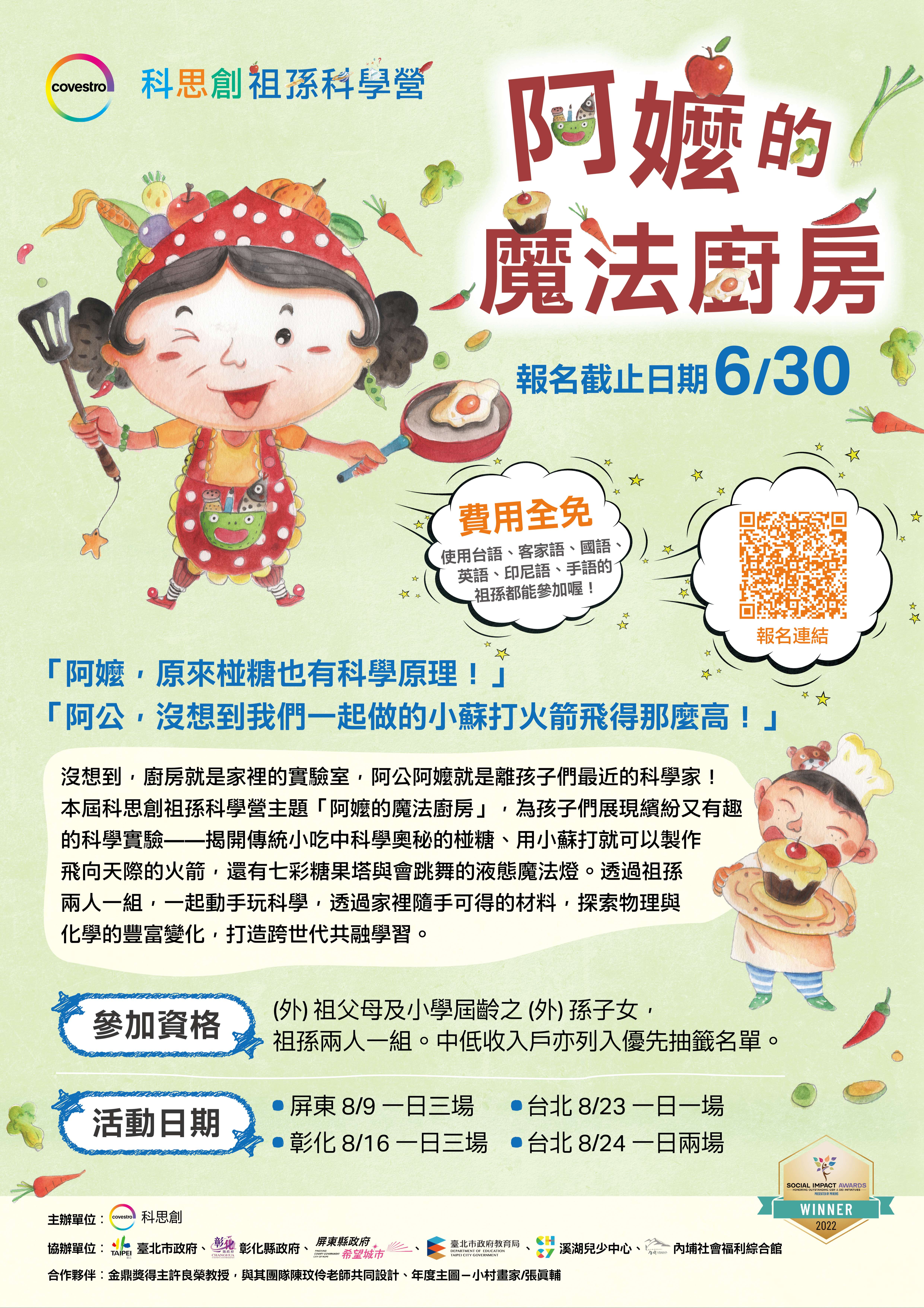 一、台灣科思創股份有限公司與臺北市教育局合作舉辦「科思創祖孫 科學營」,活動資訊說明如 下,請貴校轉知所屬學生踴躍報名: