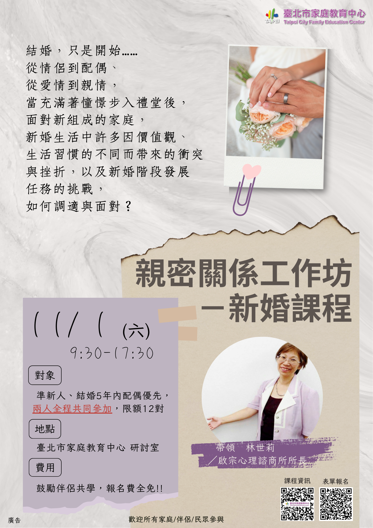 歡迎參加臺北市家庭教育中心11月1日舉辦之「親 密關係工作坊-新婚課程」,幫助家庭新鮮人迎接婚姻 生活挑戰,學習欣賞包容,順利並持續經營關係!報名請至官網查詢,家庭教育中心網站連結https://family.gov. taipei/Default.aspx。