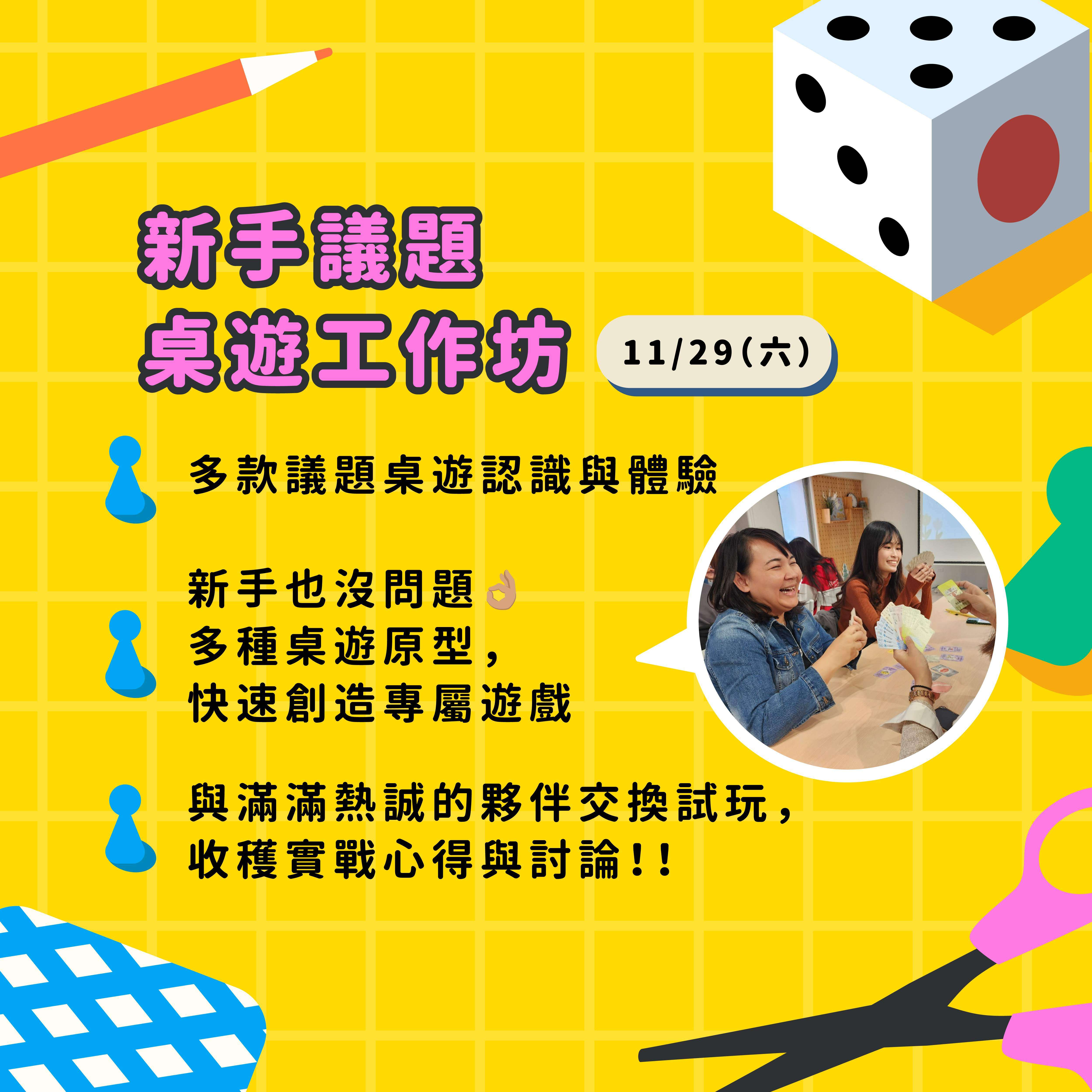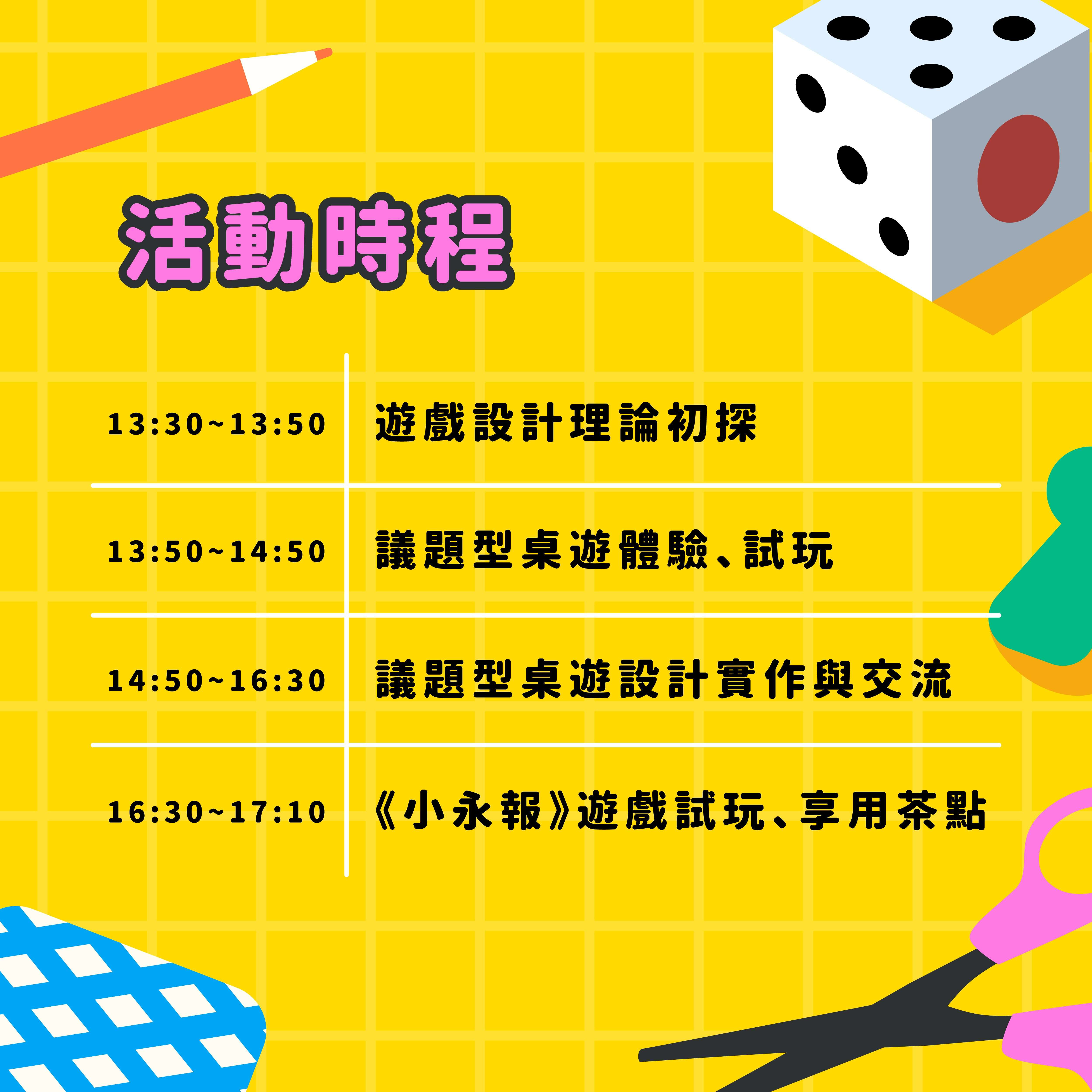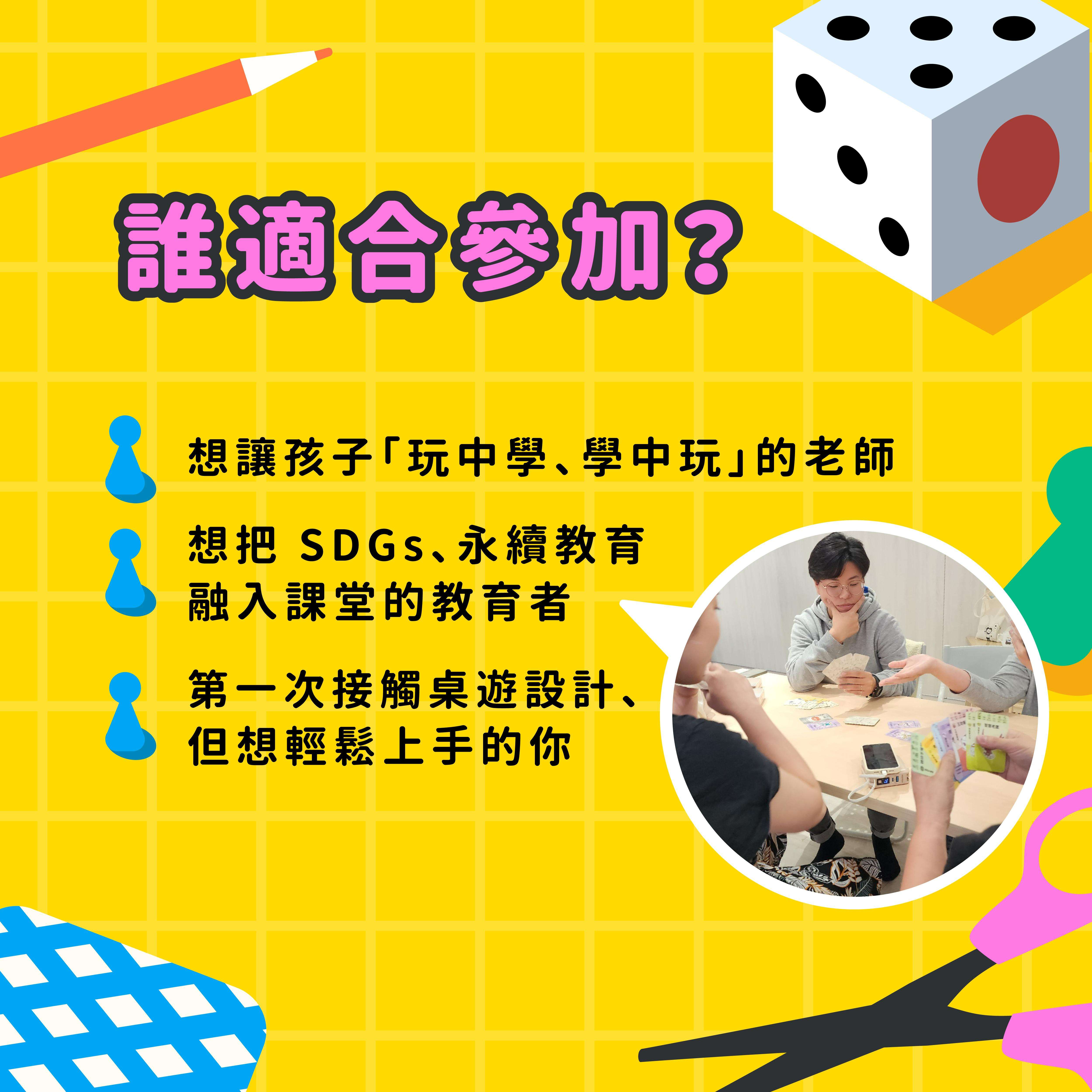 七、活動重點內容: (一)SDGs 永續議題桌遊之實際體驗與討論 (二)遊戲設計基礎理論講解與桌遊實作練習 (三)跨組試玩與教學應用回饋交流 (四)分享《小永報》永續教育資源及延伸應用 (五)完成之桌遊設計作品有機會收錄於《小永報》微型桌遊 專欄