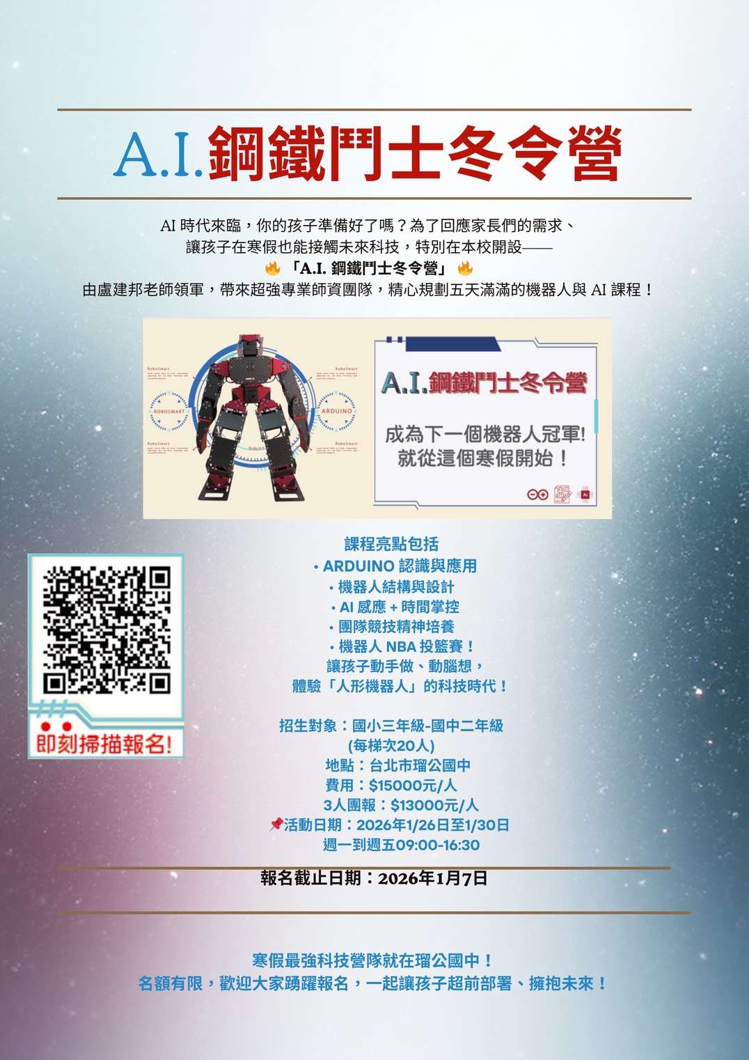 一、瑠公國中及家長會、威運科技、機盛科技辦理「AI鋼 鐵鬥士冬令營」,詳細課程資訊如附件。