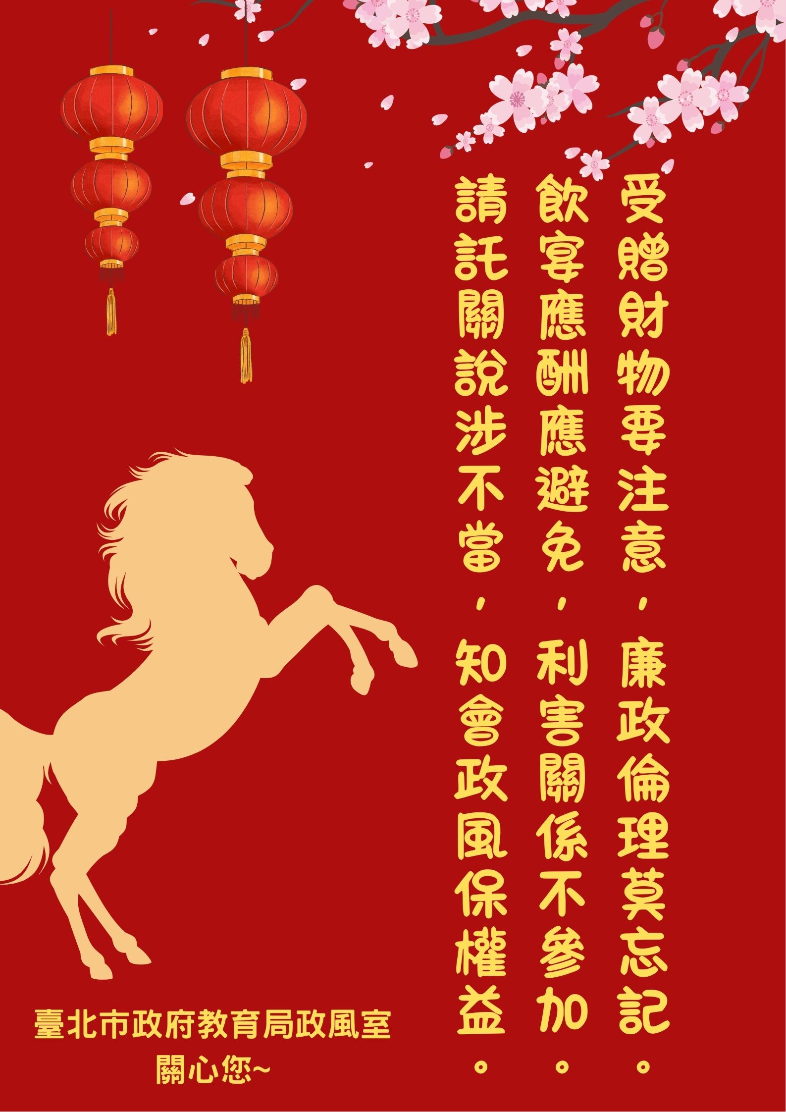 春節將屆,餽贈、邀宴行為較為頻繁,請長官同仁恪遵「臺北市政府公務員廉政倫理規範」規定,對與職務有利害關係者之受贈財物、飲宴應酬、請託關說及其他廉政倫理事件,應依規定確實報備登錄,並避免酒駕、出入不正當場所之違法違紀行為。