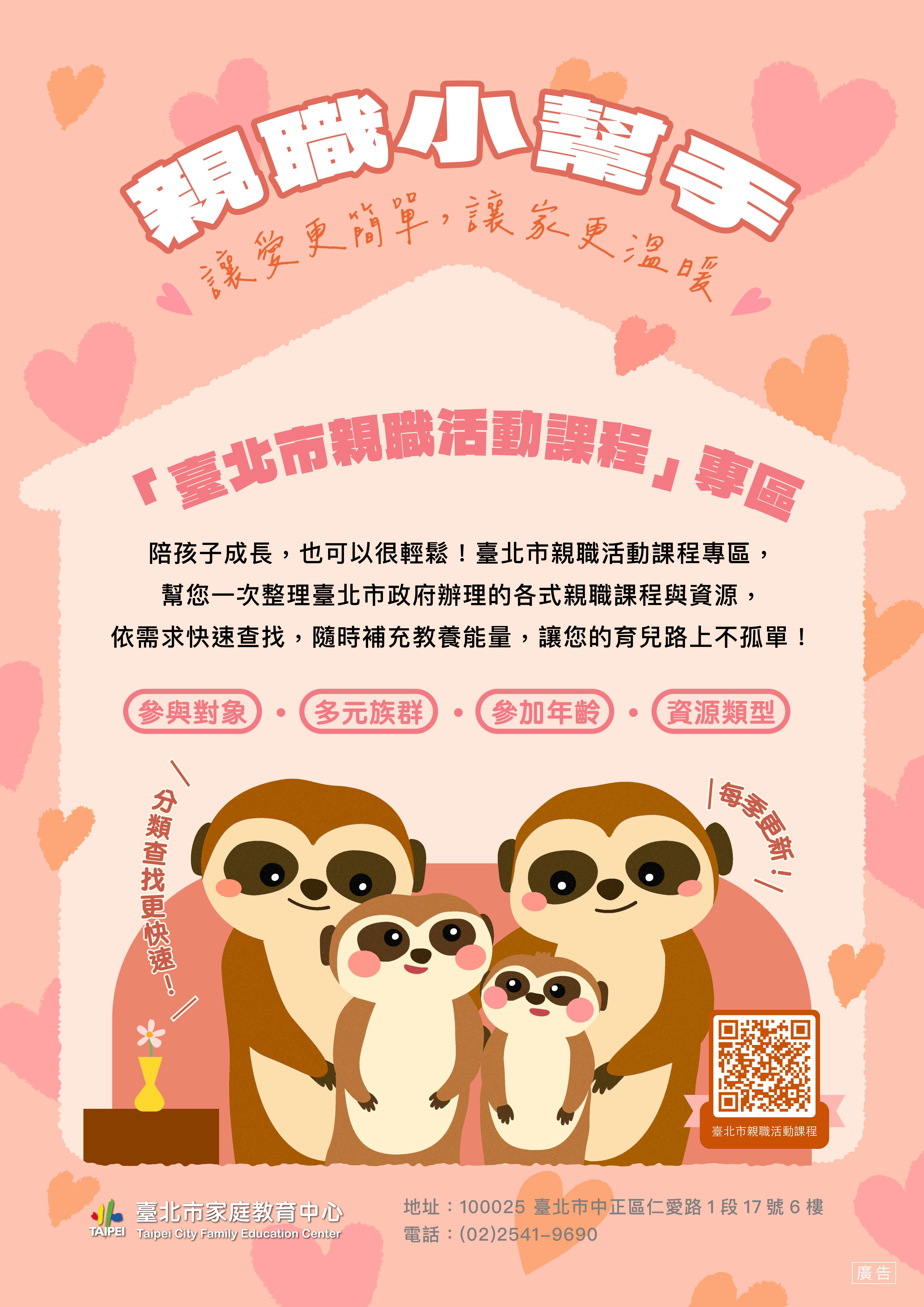 為協助家長掌握親職教育資源,臺北市家庭教育中心設置「臺北市親職活動課程專區」,每季更新臺北市政府辦理之親職課程與活動,並依參與對象與資源類型等分類,歡迎家長掃描附件QR Code查詢。